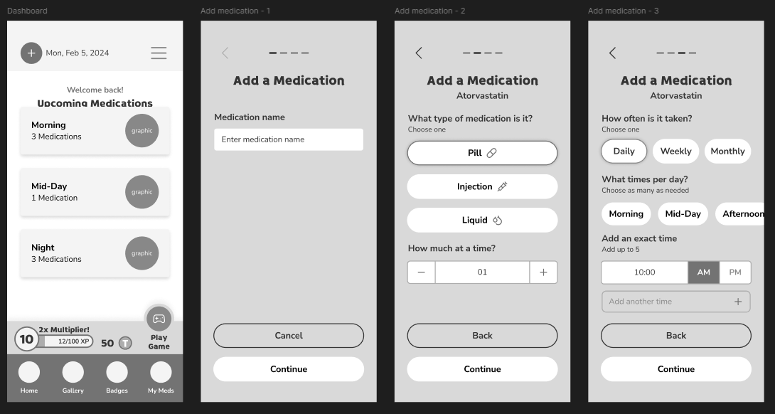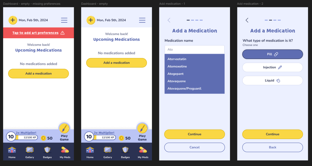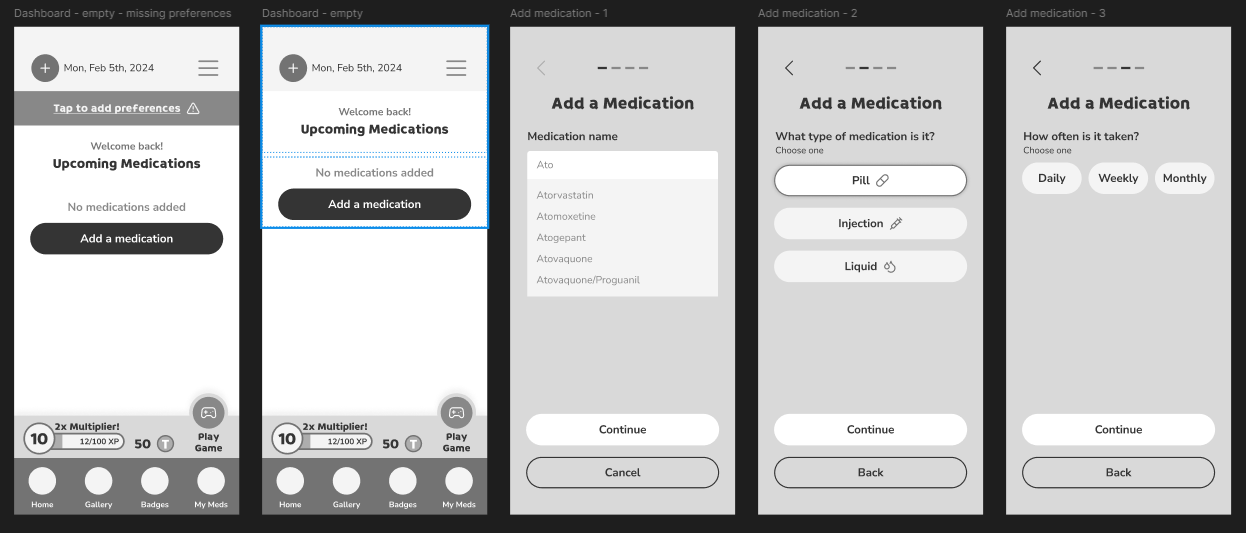 Being the first gamified app I've designed, I was a bit concerned about how it would turn out but I did my best. For the signup, I broke it up in the best way I could to keep things more digestible. Though it isn't ideal, the app signup is all at the beginning. I cannot go into full detail, but I am happy with the overall design of the app. I think on first usage, the portion to add medications was confusing, but it was later adjusted.